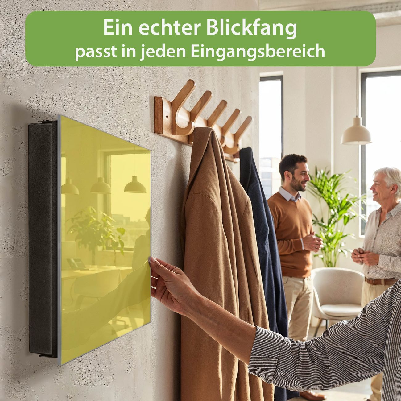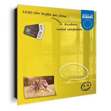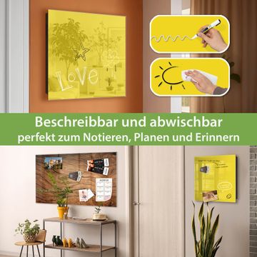 Bringe Ordnung und Eleganz in deinen Eingangsbereich mit dem banjado Schlüsselkasten Motiv Farbe Sonnengelb. Die moderne Schlüsselbox kombiniert funktionales Design mit hochwertiger Verarbeitung und wird so zu einem echten Hingucker in Flur, Büro oder Ferienwohnung. ✅ Stilvolle Schlüsselaufbewahrung mit Glasfront im Motiv Farbe Sonnengelb Der Design-Schlüsselkasten Motiv Farbe Sonnengelb bietet Platz für bis zu 50 Schlüssel, die auf 5 stabilen Reihen mit je 10 Haken übersichtlich verstaut werden. Mit seinen kompakten Maßen von 30 x 30 x 5 cm passt die Schlüsselbox perfekt auch in kleinere Räume. Der schwarz lackierte Stahlkorpus mit rechts angeschlagenem Türscharnier harmoniert mit der Glasfront und fügt sich nahtlos in jedes Wohnambiente ein. Ob als Schlüsselorganizer für Zuhause oder als praktische Lösung für Büros, Praxen und Gewerbe, der banjado Schlüsselkasten sorgt für Ordnung und Übersicht. Dank der magnetischen, mit Kreidestiften beschreibbaren Glasfront kannst du Notizen anheften oder Termine direkt auf der Oberfläche festhalten. Die Schlüsselbox Motiv Farbe Sonnengelb zur Wandmontage wird inklusive Befestigungsmaterial geliefert und ist schnell angebracht. So hast du deine Schlüssel jederzeit griffbereit und zugleich stilvoll verstaut. Mit diesem banjado Schlüsselkasten Motiv Farbe Sonnengelb kombinierst du praktische Aufbewahrung mit stilvollem Wohndesign. Ob privat oder geschäftlich, die Schlüsselbox sorgt für mehr Ordnung, Übersicht und ein wohnliches Ambiente.Vorteile im Überblick