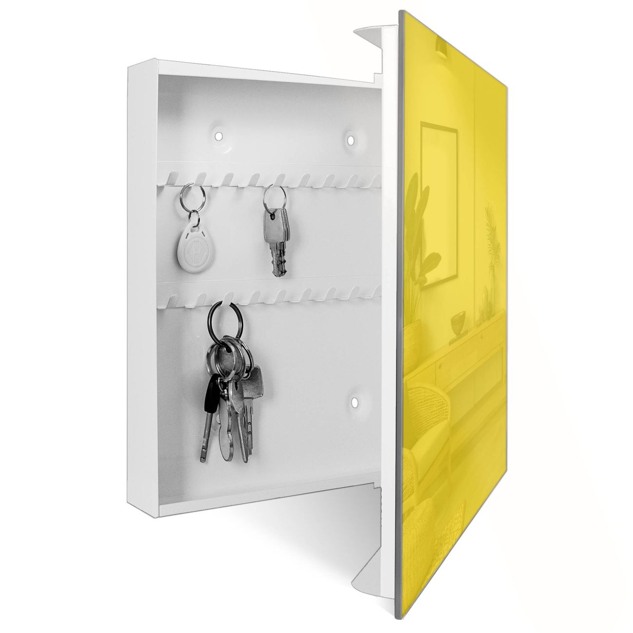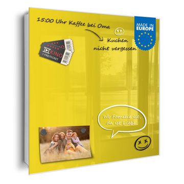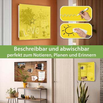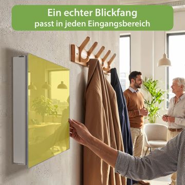 Bringe Ordnung und Eleganz in deinen Eingangsbereich mit dem banjado Schlüsselkasten Motiv Farbe Sonnengelb. Die moderne Schlüsselbox kombiniert funktionales Design mit hochwertiger Verarbeitung und wird so zu einem echten Hingucker in Flur, Büro oder Ferienwohnung. ✅ Stilvolle Schlüsselaufbewahrung mit Glasfront im Motiv Farbe Sonnengelb Der Design-Schlüsselkasten Motiv Farbe Sonnengelb bietet Platz für bis zu 50 Schlüssel, die auf 5 stabilen Reihen mit je 10 Haken übersichtlich verstaut werden. Mit seinen kompakten Maßen von 30 x 30 x 5 cm passt die Schlüsselbox perfekt auch in kleinere Räume. Der weiß lackierte Stahlkorpus mit rechts angeschlagenem Türscharnier harmoniert mit der Glasfront und fügt sich nahtlos in jedes Wohnambiente ein. Ob als Schlüsselorganizer für Zuhause oder als praktische Lösung für Büros, Praxen und Gewerbe, der banjado Schlüsselkasten sorgt für Ordnung und Übersicht. Dank der magnetischen, mit Kreidestiften beschreibbaren Glasfront kannst du Notizen anheften oder Termine direkt auf der Oberfläche festhalten. Die Schlüsselbox Motiv Farbe Sonnengelb zur Wandmontage wird inklusive Befestigungsmaterial geliefert und ist schnell angebracht. So hast du deine Schlüssel jederzeit griffbereit und zugleich stilvoll verstaut. Mit diesem banjado Schlüsselkasten Motiv Farbe Sonnengelb kombinierst du praktische Aufbewahrung mit stilvollem Wohndesign. Ob privat oder geschäftlich, die Schlüsselbox sorgt für mehr Ordnung, Übersicht und ein wohnliches Ambiente.Vorteile im Überblick