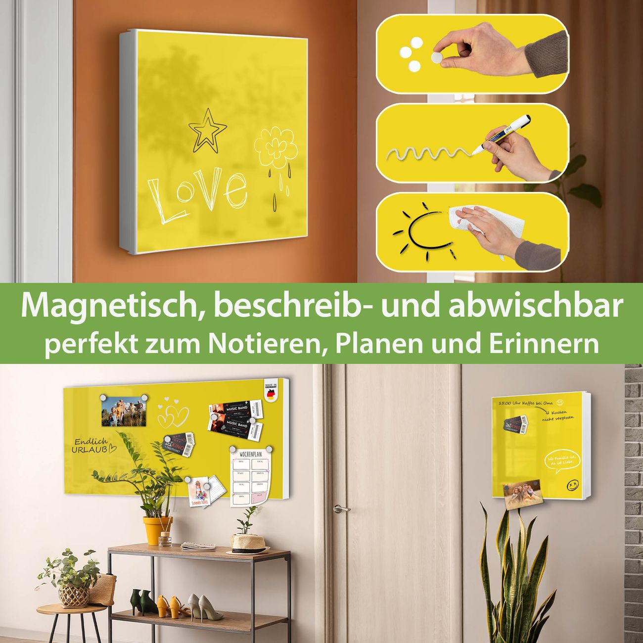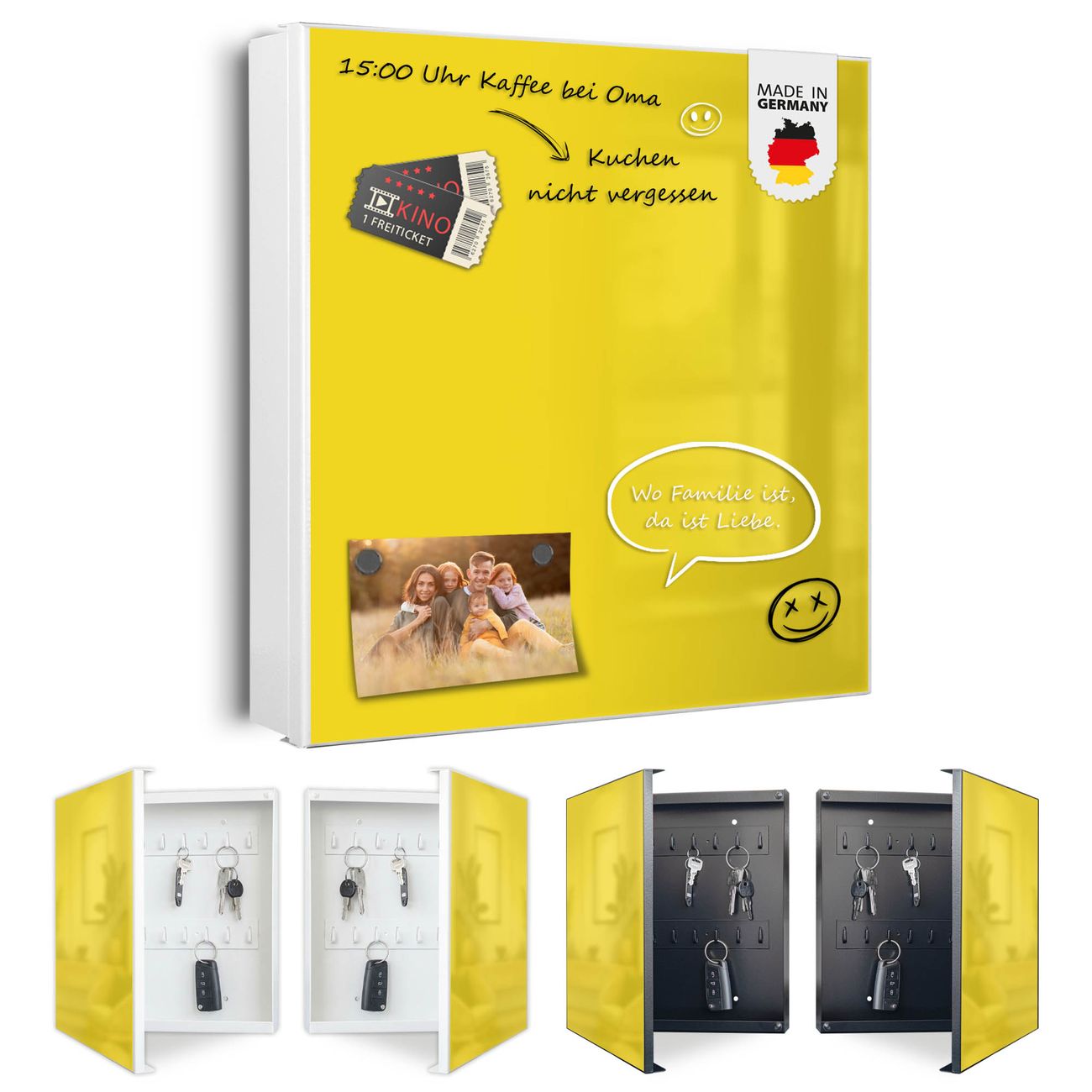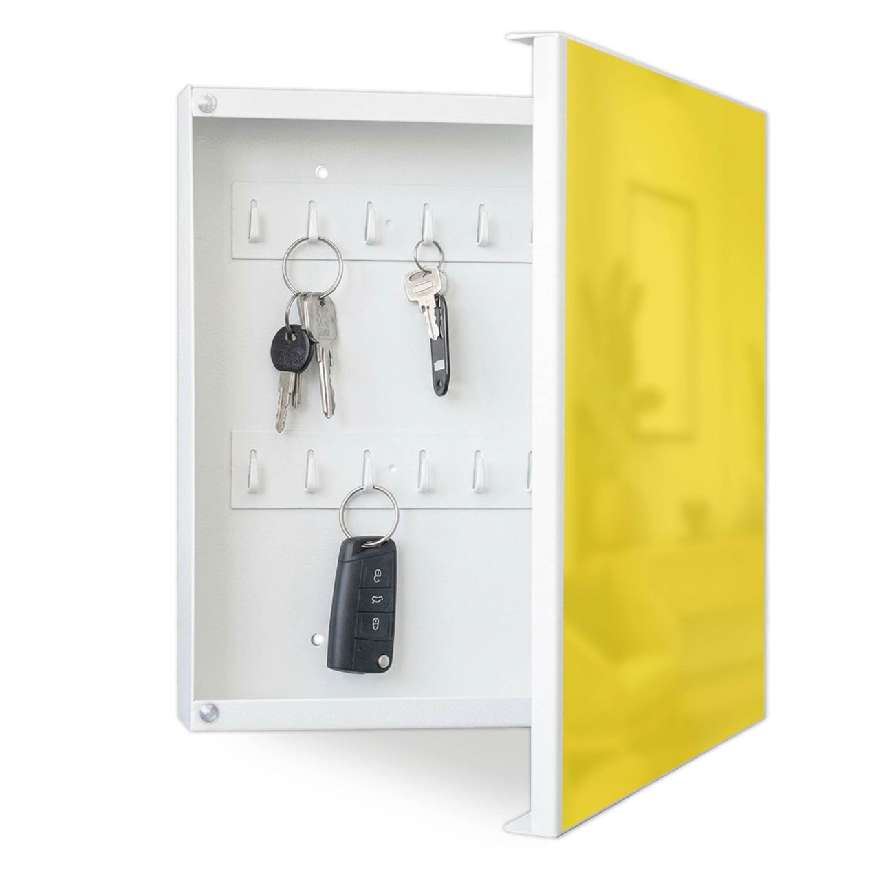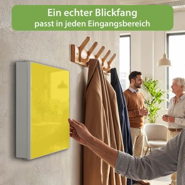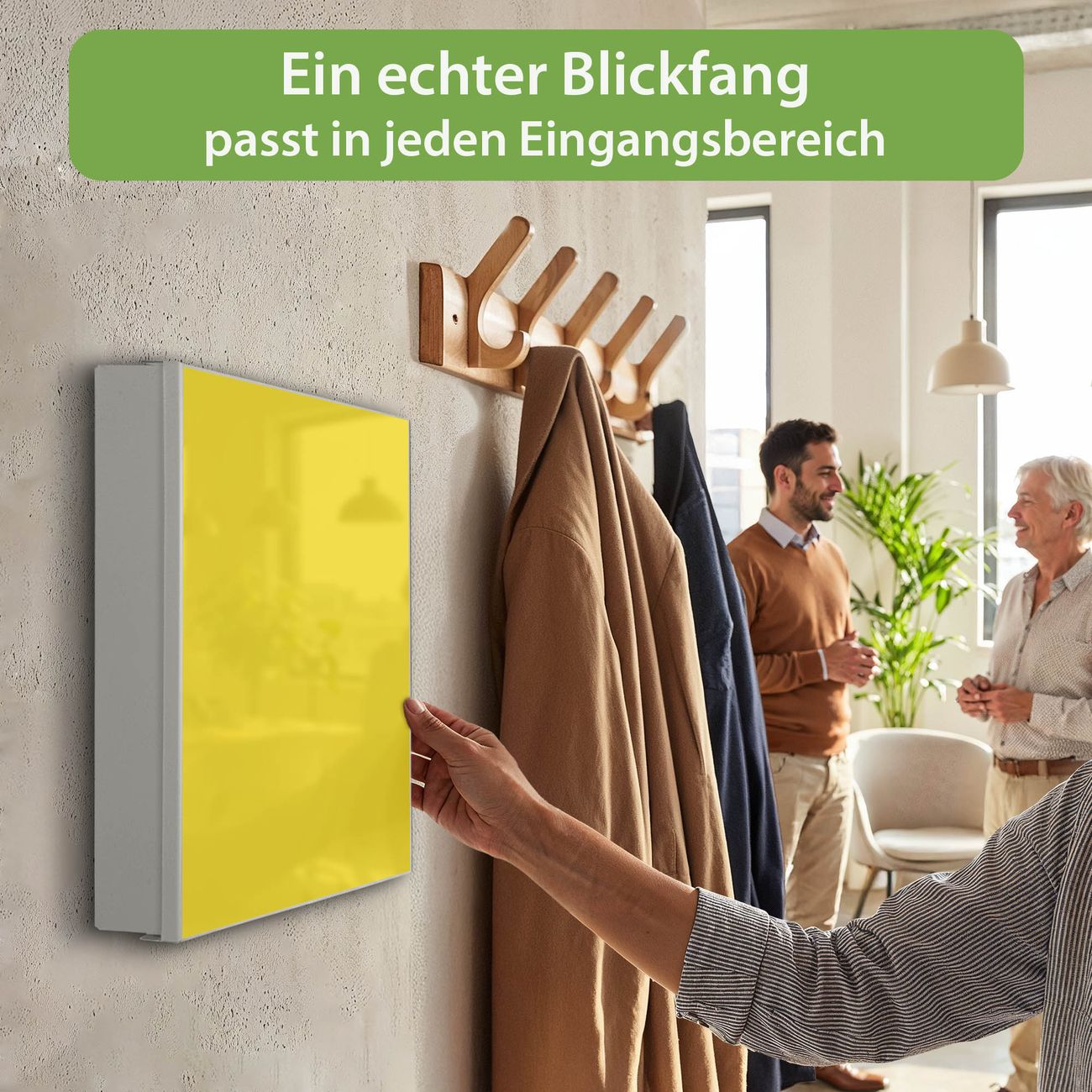 Bringe Ordnung und Eleganz in deinen Eingangsbereich mit dem banjado Schlüsselkasten Motiv Farbe Sonnengelb. Die moderne Schlüsselbox kombiniert funktionales Design mit hochwertiger Verarbeitung und wird so zu einem echten Hingucker in Flur, Büro oder Ferienwohnung. ✅ Stilvolle Schlüsselaufbewahrung mit Motiv Farbe Sonnengelb Der Design-Schlüsselkasten Motiv Farbe Sonnengelb bietet Platz für bis zu 32 Schlüssel, die auf 4 stabilen Reihen mit je 8 Haken übersichtlich verstaut werden. Mit seinen kompakten Maßen von 30 x 30 x 5 cm passt die Schlüsselbox perfekt auch in kleinere Räume. Der weiß lackierte Stahlkorpus mit rechts angeschlagenem Türscharnier harmoniert mit gedruckten Folie auf der Front und fügt sich nahtlos in jedes Wohnambiente ein. Ob als Schlüsselorganizer für Zuhause oder als praktische Lösung für Büros, Praxen und Gewerbe, der banjado Schlüsselkasten sorgt für Ordnung und Übersicht. Dank der magnetischen, mit Kreidestiften beschreibbaren Folie auf der Front kannst du Notizen anheften oder Termine direkt auf der Oberfläche festhalten. Die Schlüsselbox Motiv Farbe Sonnengelb zur Wandmontage wird inklusive Befestigungsmaterial geliefert und ist schnell angebracht. So hast du deine Schlüssel jederzeit griffbereit und zugleich stilvoll verstaut. Mit diesem banjado Schlüsselkasten Motiv Farbe Sonnengelb kombinierst du praktische Aufbewahrung mit stilvollem Wohndesign. Ob privat oder geschäftlich, die Schlüsselbox sorgt für mehr Ordnung, Übersicht und ein wohnliches Ambiente.Vorteile im Überblick