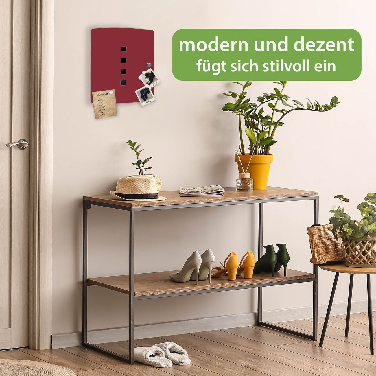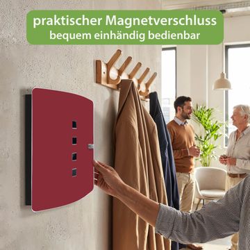 Funktion / Nutzen: Die leicht geschwungene Edelstahltür ist mit einer hochwertigen Motivfolie und dem Motiv Farbe Burgund kaschiert. Ein praktischer Magnetverschluss ermöglicht Ihnen ein schnelles Öffnen und Schließen. Befestigt wird der Schlüsselkasten an 2 Stellen auf der Rückseite, passendes Montagematerial fügen wir bereits bei.