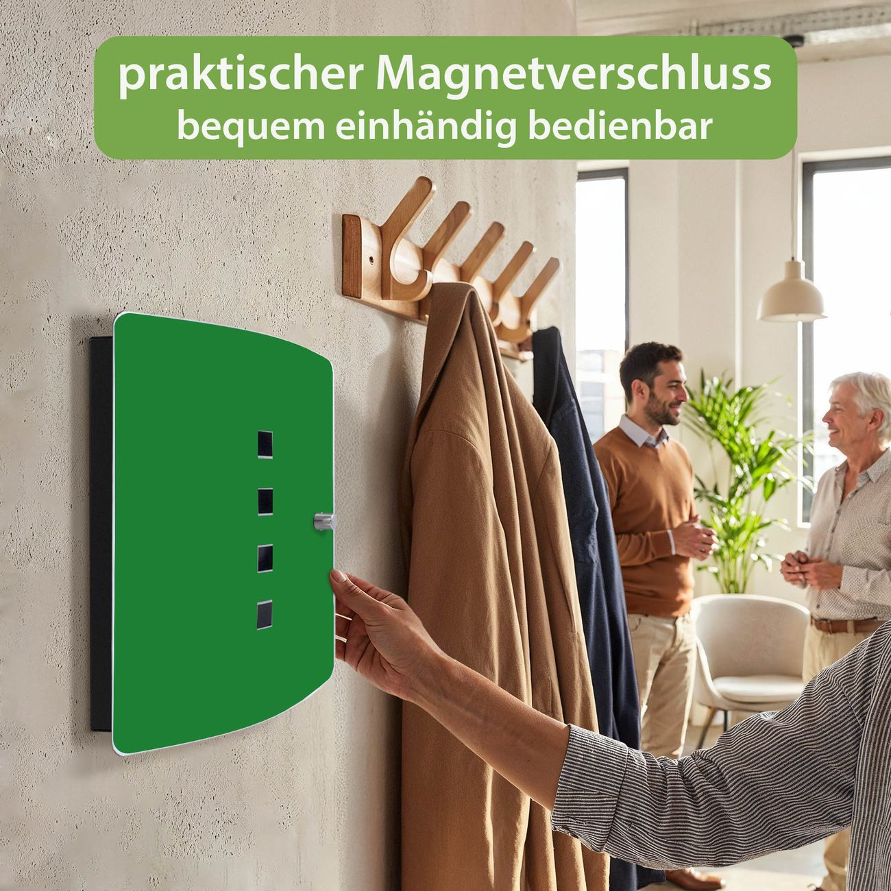 Funktion / Nutzen: Die leicht geschwungene Edelstahltür ist mit einer hochwertigen Motivfolie und dem Motiv Farbe Grün kaschiert. Ein praktischer Magnetverschluss ermöglicht Ihnen ein schnelles Öffnen und Schließen. Befestigt wird der Schlüsselkasten an 2 Stellen auf der Rückseite, passendes Montagematerial fügen wir bereits bei.