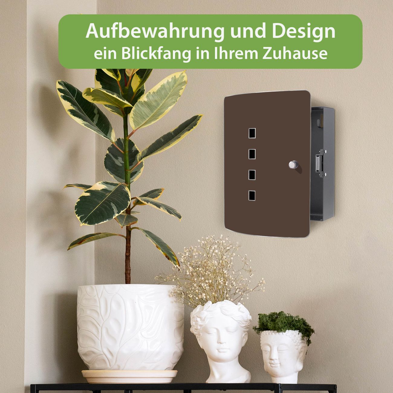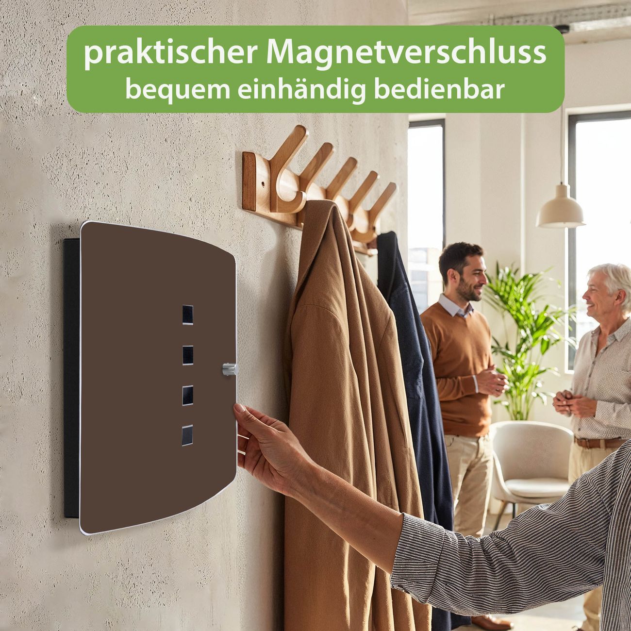 Funktion / Nutzen: Die leicht geschwungene Edelstahltür ist mit einer hochwertigen Motivfolie und dem Motiv Farbe Schokobraun kaschiert. Ein praktischer Magnetverschluss ermöglicht Ihnen ein schnelles Öffnen und Schließen. Befestigt wird der Schlüsselkasten an 2 Stellen auf der Rückseite, passendes Montagematerial fügen wir bereits bei.