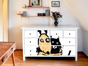 FUNKTION: Die banjado Möbelfolie mit Motiv Beste Freunde Immer zaubert im Handumdrehen aus Ihrer Ikea HEMNES Kommode ein individuell gestaltetes Unikat. Verziert mit einem traumhaften Motiv verbindet die HEMNES Kommode jede Menge Stauraum mit ansprechendem Design. Die gezeigte IKEA HEMNES Komode ist nicht im Angebot enthalten. DESIGN: Die banjado Klebefolie gestaltet Ihr Ikea Möbelstück völlig neu. So passt sich die HEMNESKommode verschiedenen Einrichtungsstilen an. Lassen Sie Ihrer Kreativität freien Raum, wir helfen Ihnen bei der Umsetzung. DETAILS: Der banjado Beste Freunde Immer Möbelsticker ist selbstklebend und wird Ihnen bereits fertig zugeschnitten geliefert. Sie können Schritt für Schritt jede Schublade einzeln bekleben, eine detaillierte Verklebeanleitung liegt selbstverständlich bei. Die Folie ist mit einem zusätzlichen Laminat überzogen, dass Ihr Möbelstück zusätzlich vor Kratzern schützt. NUTZEN: Sie können die banjado Möbelfolie wunderbar nutzen, um abgeplatzte, schmutzige oder unschöne Stellen an Ihrer Malm Kommode zu überdecken. Mit einem wechselnden Design können Sie Ihren Einrichtungsstil ändern oder aus einer Kinderkommode eine Flurkommode gestalten. Alle verwendeten Farben sind lösungsmittelfrei. BANJADO: Ihre Design Folie wird in Sachsen in einer kleinen Manufaktur angefertigt und verpackt. Wir legen großen Wert auf die Verbindung von Funktionalität und Design.