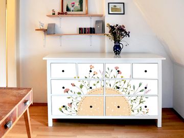 FUNKTION: Die banjado Möbelfolie mit Motiv Hibiskus Kreis zaubert im Handumdrehen aus Ihrer Ikea HEMNES Kommode ein individuell gestaltetes Unikat. Verziert mit einem traumhaften Motiv verbindet die HEMNES Kommode jede Menge Stauraum mit ansprechendem Design. Die gezeigte IKEA HEMNES Komode ist nicht im Angebot enthalten. DESIGN: Die banjado Klebefolie gestaltet Ihr Ikea Möbelstück völlig neu. So passt sich die HEMNESKommode verschiedenen Einrichtungsstilen an. Lassen Sie Ihrer Kreativität freien Raum, wir helfen Ihnen bei der Umsetzung. DETAILS: Der banjado Hibiskus Kreis Möbelsticker ist selbstklebend und wird Ihnen bereits fertig zugeschnitten geliefert. Sie können Schritt für Schritt jede Schublade einzeln bekleben, eine detaillierte Verklebeanleitung liegt selbstverständlich bei. Die Folie ist mit einem zusätzlichen Laminat überzogen, dass Ihr Möbelstück zusätzlich vor Kratzern schützt. NUTZEN: Sie können die banjado Möbelfolie wunderbar nutzen, um abgeplatzte, schmutzige oder unschöne Stellen an Ihrer Malm Kommode zu überdecken. Mit einem wechselnden Design können Sie Ihren Einrichtungsstil ändern oder aus einer Kinderkommode eine Flurkommode gestalten. Alle verwendeten Farben sind lösungsmittelfrei. BANJADO: Ihre Design Folie wird in Sachsen in einer kleinen Manufaktur angefertigt und verpackt. Wir legen großen Wert auf die Verbindung von Funktionalität und Design.
