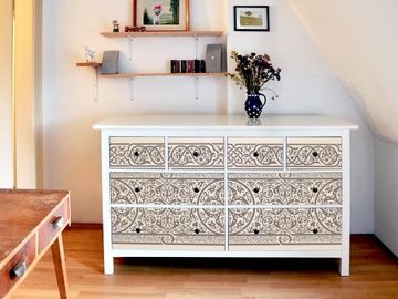 FUNKTION: Die banjado Möbelfolie mit Motiv Keltischer Knoten zaubert im Handumdrehen aus Ihrer Ikea HEMNES Kommode ein individuell gestaltetes Unikat. Verziert mit einem traumhaften Motiv verbindet die HEMNES Kommode jede Menge Stauraum mit ansprechendem Design. Die gezeigte IKEA HEMNES Komode ist nicht im Angebot enthalten. DESIGN: Die banjado Klebefolie gestaltet Ihr Ikea Möbelstück völlig neu. So passt sich die HEMNESKommode verschiedenen Einrichtungsstilen an. Lassen Sie Ihrer Kreativität freien Raum, wir helfen Ihnen bei der Umsetzung. DETAILS: Der banjado Keltischer Knoten Möbelsticker ist selbstklebend und wird Ihnen bereits fertig zugeschnitten geliefert. Sie können Schritt für Schritt jede Schublade einzeln bekleben, eine detaillierte Verklebeanleitung liegt selbstverständlich bei. Die Folie ist mit einem zusätzlichen Laminat überzogen, dass Ihr Möbelstück zusätzlich vor Kratzern schützt. NUTZEN: Sie können die banjado Möbelfolie wunderbar nutzen, um abgeplatzte, schmutzige oder unschöne Stellen an Ihrer Malm Kommode zu überdecken. Mit einem wechselnden Design können Sie Ihren Einrichtungsstil ändern oder aus einer Kinderkommode eine Flurkommode gestalten. Alle verwendeten Farben sind lösungsmittelfrei. BANJADO: Ihre Design Folie wird in Sachsen in einer kleinen Manufaktur angefertigt und verpackt. Wir legen großen Wert auf die Verbindung von Funktionalität und Design.
