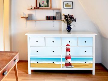 FUNKTION: Die banjado Möbelfolie mit Motiv Leuchtturm Illustration zaubert im Handumdrehen aus Ihrer Ikea HEMNES Kommode ein individuell gestaltetes Unikat. Verziert mit einem traumhaften Motiv verbindet die HEMNES Kommode jede Menge Stauraum mit ansprechendem Design. Die gezeigte IKEA HEMNES Komode ist nicht im Angebot enthalten. DESIGN: Die banjado Klebefolie gestaltet Ihr Ikea Möbelstück völlig neu. So passt sich die HEMNESKommode verschiedenen Einrichtungsstilen an. Lassen Sie Ihrer Kreativität freien Raum, wir helfen Ihnen bei der Umsetzung. DETAILS: Der banjado Leuchtturm Illustration Möbelsticker ist selbstklebend und wird Ihnen bereits fertig zugeschnitten geliefert. Sie können Schritt für Schritt jede Schublade einzeln bekleben, eine detaillierte Verklebeanleitung liegt selbstverständlich bei. Die Folie ist mit einem zusätzlichen Laminat überzogen, dass Ihr Möbelstück zusätzlich vor Kratzern schützt. NUTZEN: Sie können die banjado Möbelfolie wunderbar nutzen, um abgeplatzte, schmutzige oder unschöne Stellen an Ihrer Malm Kommode zu überdecken. Mit einem wechselnden Design können Sie Ihren Einrichtungsstil ändern oder aus einer Kinderkommode eine Flurkommode gestalten. Alle verwendeten Farben sind lösungsmittelfrei. BANJADO: Ihre Design Folie wird in Sachsen in einer kleinen Manufaktur angefertigt und verpackt. Wir legen großen Wert auf die Verbindung von Funktionalität und Design.