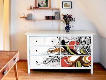 FUNKTION: Die banjado Möbelfolie mit Motiv Ornament 2 zaubert im Handumdrehen aus Ihrer Ikea HEMNES Kommode ein individuell gestaltetes Unikat. Verziert mit einem traumhaften Motiv verbindet die HEMNES Kommode jede Menge Stauraum mit ansprechendem Design. Die gezeigte IKEA HEMNES Komode ist nicht im Angebot enthalten. DESIGN: Die banjado Klebefolie gestaltet Ihr Ikea Möbelstück völlig neu. So passt sich die HEMNESKommode verschiedenen Einrichtungsstilen an. Lassen Sie Ihrer Kreativität freien Raum, wir helfen Ihnen bei der Umsetzung. DETAILS: Der banjado Ornament 2 Möbelsticker ist selbstklebend und wird Ihnen bereits fertig zugeschnitten geliefert. Sie können Schritt für Schritt jede Schublade einzeln bekleben, eine detaillierte Verklebeanleitung liegt selbstverständlich bei. Die Folie ist mit einem zusätzlichen Laminat überzogen, dass Ihr Möbelstück zusätzlich vor Kratzern schützt. NUTZEN: Sie können die banjado Möbelfolie wunderbar nutzen, um abgeplatzte, schmutzige oder unschöne Stellen an Ihrer Malm Kommode zu überdecken. Mit einem wechselnden Design können Sie Ihren Einrichtungsstil ändern oder aus einer Kinderkommode eine Flurkommode gestalten. Alle verwendeten Farben sind lösungsmittelfrei. BANJADO: Ihre Design Folie wird in Sachsen in einer kleinen Manufaktur angefertigt und verpackt. Wir legen großen Wert auf die Verbindung von Funktionalität und Design.
