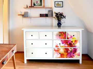 FUNKTION: Die banjado Möbelfolie mit Motiv Pink Explosion zaubert im Handumdrehen aus Ihrer Ikea HEMNES Kommode ein individuell gestaltetes Unikat. Verziert mit einem traumhaften Motiv verbindet die HEMNES Kommode jede Menge Stauraum mit ansprechendem Design. Die gezeigte IKEA HEMNES Komode ist nicht im Angebot enthalten. DESIGN: Die banjado Klebefolie gestaltet Ihr Ikea Möbelstück völlig neu. So passt sich die HEMNESKommode verschiedenen Einrichtungsstilen an. Lassen Sie Ihrer Kreativität freien Raum, wir helfen Ihnen bei der Umsetzung. DETAILS: Der banjado Pink Explosion Möbelsticker ist selbstklebend und wird Ihnen bereits fertig zugeschnitten geliefert. Sie können Schritt für Schritt jede Schublade einzeln bekleben, eine detaillierte Verklebeanleitung liegt selbstverständlich bei. Die Folie ist mit einem zusätzlichen Laminat überzogen, dass Ihr Möbelstück zusätzlich vor Kratzern schützt. NUTZEN: Sie können die banjado Möbelfolie wunderbar nutzen, um abgeplatzte, schmutzige oder unschöne Stellen an Ihrer Malm Kommode zu überdecken. Mit einem wechselnden Design können Sie Ihren Einrichtungsstil ändern oder aus einer Kinderkommode eine Flurkommode gestalten. Alle verwendeten Farben sind lösungsmittelfrei. BANJADO: Ihre Design Folie wird in Sachsen in einer kleinen Manufaktur angefertigt und verpackt. Wir legen großen Wert auf die Verbindung von Funktionalität und Design.
