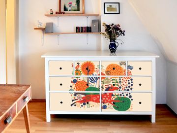 FUNKTION: Die banjado Möbelfolie mit Motiv Rotes Pferd zaubert im Handumdrehen aus Ihrer Ikea HEMNES Kommode ein individuell gestaltetes Unikat. Verziert mit einem traumhaften Motiv verbindet die HEMNES Kommode jede Menge Stauraum mit ansprechendem Design. Die gezeigte IKEA HEMNES Komode ist nicht im Angebot enthalten. DESIGN: Die banjado Klebefolie gestaltet Ihr Ikea Möbelstück völlig neu. So passt sich die HEMNESKommode verschiedenen Einrichtungsstilen an. Lassen Sie Ihrer Kreativität freien Raum, wir helfen Ihnen bei der Umsetzung. DETAILS: Der banjado Rotes Pferd Möbelsticker ist selbstklebend und wird Ihnen bereits fertig zugeschnitten geliefert. Sie können Schritt für Schritt jede Schublade einzeln bekleben, eine detaillierte Verklebeanleitung liegt selbstverständlich bei. Die Folie ist mit einem zusätzlichen Laminat überzogen, dass Ihr Möbelstück zusätzlich vor Kratzern schützt. NUTZEN: Sie können die banjado Möbelfolie wunderbar nutzen, um abgeplatzte, schmutzige oder unschöne Stellen an Ihrer Malm Kommode zu überdecken. Mit einem wechselnden Design können Sie Ihren Einrichtungsstil ändern oder aus einer Kinderkommode eine Flurkommode gestalten. Alle verwendeten Farben sind lösungsmittelfrei. BANJADO: Ihre Design Folie wird in Sachsen in einer kleinen Manufaktur angefertigt und verpackt. Wir legen großen Wert auf die Verbindung von Funktionalität und Design.