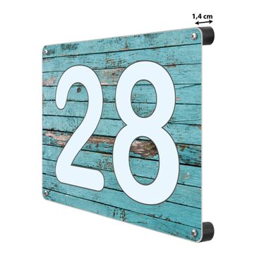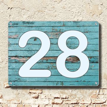 Hausnummernschild Edelstahl personalisierbar Blaue Holzlatten