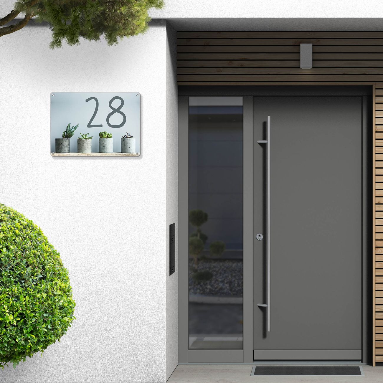 Das banjado Hausnummer Schild ist mit 4 Schrauben einfach am Haus anzubringen und zeigt dank der Größe stilsicher Ihre Hausnummer oder auch individuell Hausnummer mit Straßennamen. Das Hausschild personalisiert können Sie ganz auf Ihre Wünsche anpassen. Wir bieten verschiedenste Motive an. Dazu können Sie das Schild mit Ihrer Hausnummer anpassen.