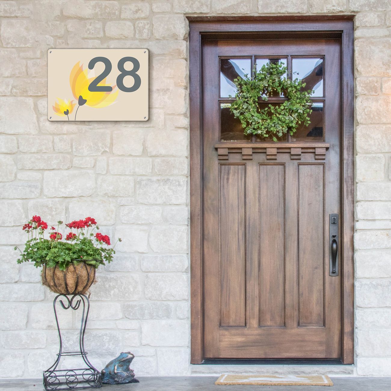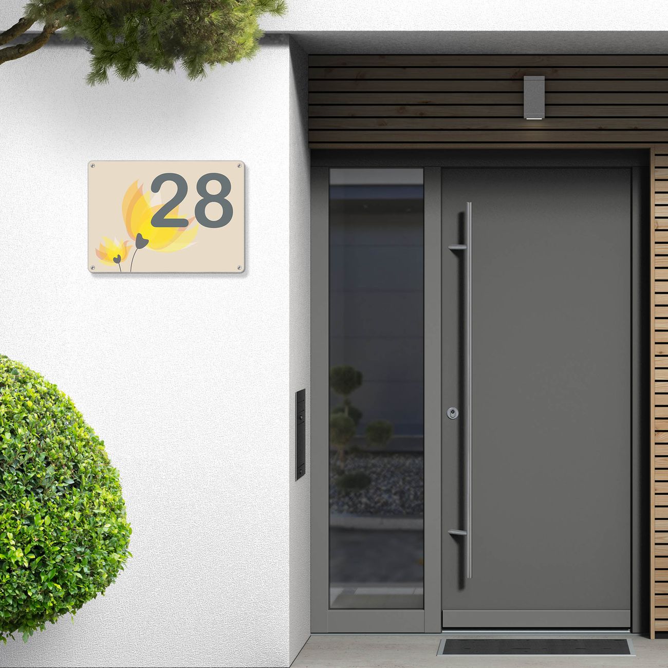 Das banjado Hausnummer Schild ist mit 4 Schrauben einfach am Haus anzubringen und zeigt dank der Größe stilsicher Ihre Hausnummer oder auch individuell Hausnummer mit Straßennamen. Das Hausschild personalisiert können Sie ganz auf Ihre Wünsche anpassen. Wir bieten verschiedenste Motive an. Dazu können Sie das Schild mit Ihrer Hausnummer anpassen.
