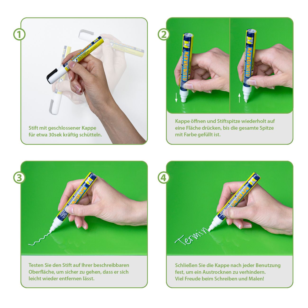 Mit unserem wasserbasierten Kreidestift in verschiedenen Farben bekommst du ein vielseitiges Kreativ-Werkzeug für alle glatten Oberflächen. Egal ob Glasscheiben, Whiteboards, Spiegel, Glasmagnettafeln oder Kunststoffflächen – dieser Kreidemarker schreibt sauber und deutlich, lässt sich jederzeit wieder leicht mit einem feuchten Tuch abwischen und ist damit perfekt für wechselnde Beschriftungen oder kreative Dekoideen geeignet. Die wasserbasierte, lösungsmittelfreie Tinte sorgt dafür, dass keine unangenehmen Gerüche entstehen und die Nutzung angenehm bleibt – ideal für Zuhause, Büro, Gastronomie oder Schule. Die flexible Spitze ermöglicht Linien von ca. 1 mm bis 6 mm Breite, einfach durch unterschiedliches Halten des Stiftes. So lässt sich sowohl fein schreiben als auch flächig gestalten – deiner Kreativität sind kaum Grenzen gesetzt. Mit unserem wasserbasierten Kreidestift in verschiedenen Farben bekommst du ein vielseitiges Kreativ-Werkzeug für alle glatten Oberflächen. Egal ob Glasscheiben, Whiteboards, Spiegel, Glasmagnettafeln oder Kunststoffflächen – dieser Kreidemarker schreibt sauber und deutlich, lässt sich jederzeit wieder leicht mit einem feuchten Tuch abwischen und ist damit perfekt für wechselnde Beschriftungen oder kreative Dekoideen geeignet. Die wasserbasierte, lösungsmittelfreie Tinte sorgt dafür, dass keine unangenehmen Gerüche entstehen und die Nutzung angenehm bleibt – ideal für Zuhause, Büro, Gastronomie oder Schule. Die flexible Spitze ermöglicht Linien von ca. 1 mm bis 6 mm Breite, einfach durch unterschiedliches Halten des Stiftes. So lässt sich sowohl fein schreiben als auch flächig gestalten – deiner Kreativität sind kaum Grenzen gesetzt.