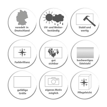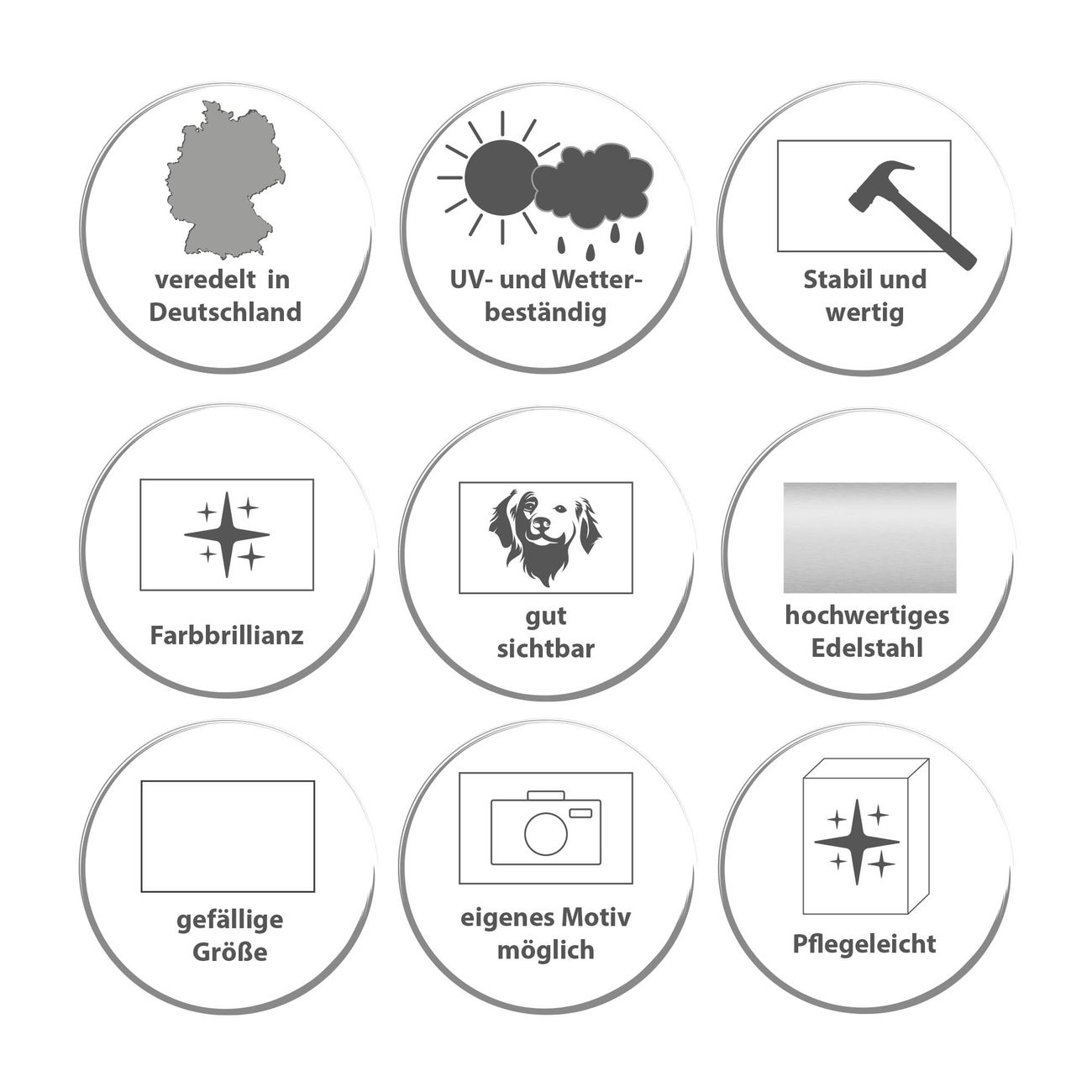 FUNKTION: Das banjado Vorsicht Hund Schild ist mit 4 Schrauben einfach am Zaun anzubringen oder der Mauer. Durch die Größe ist das Schild schnell und leicht zu erkennen. DESIGN: Das Vorsicht Hund Schild können Sie ganz auf Ihre Wünsche anpassen. Wir bieten verschiedenste Motive an und gern auch mit eigenem Foto und Text gestalten. DETAILS: Die Schilder sind 32,2 x 23 cm groß und aus robustem Edelstahl gefertigt. Das Schild kommt ohne Montagematerial was Ihnen die Wahl des Einsatzorter noch individueller macht. WETTERFEST: Die in Deutschland veredelten banjado Vorsicht Hund Schilder sind UV- und Wetterbeständig. BANJADO: Ihr individuelles Schild wird in Sachsen in einer kleinen Manufaktur personalisiert & liebevoll verpackt. Viel Freude mit Ihrem Vorsicht Hund Schild wünscht das banjado-Team.